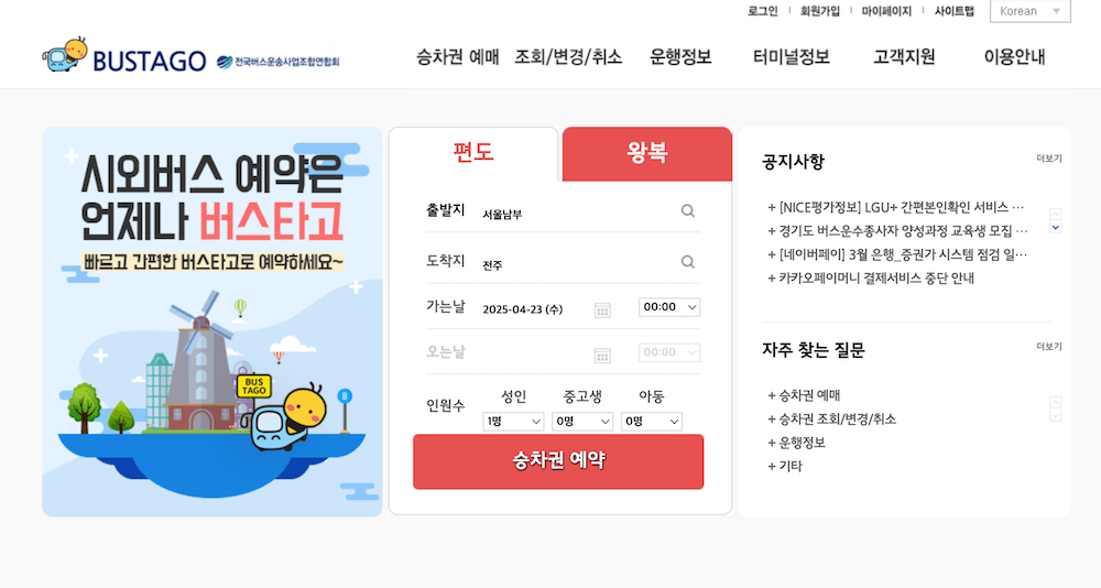 - ‘버스타고’ 또는 ‘코버스’와 같은 공식 예매 사이트에 접속합니다.